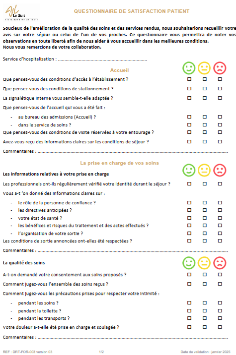 Votre satisfaction et l’amélioration continue de votre prise en charge sont les objectifs prioritaires de l’établissement. Vos retours, nous permettent d'améliorer la prise en charge. L'établissement vous propose 2 canaux de retours possibles :