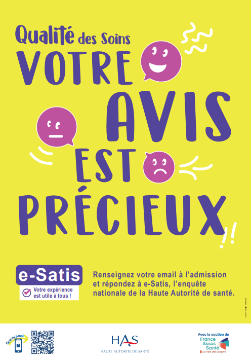- Par ailleurs, l’établissement participe à l’enquête nationale de satisfaction des patients, coordonnée par le Ministère de la Santé et la Haute Autorité de Santé (HAS). Dans ce cadre, vous pouvez être sollicité par mail après votre sortie à participer à celle-ci cf. flyer ci-dessous)